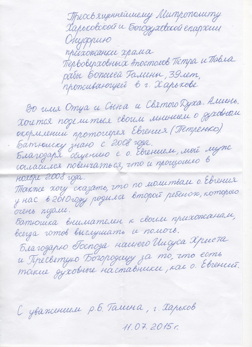 Письмо от прихожанки храма Первоверховных Апостолов Петра и Павла Галины